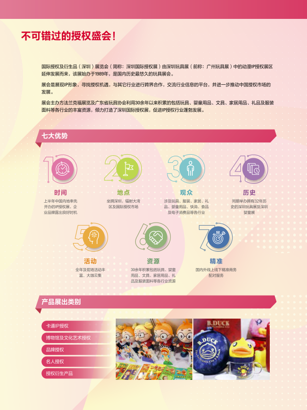 内容摘要: 国际授权及衍生品(深圳)展览会的开办将大力促进授权品牌与传统玩具制造业件务业的融合,有助企业转型升级,亦好推动大湾区的文化创意发展,为消费市场带来更多授权衍生产品……