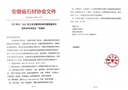 2021第5届安徽合肥绿色建筑建材及装饰材料博览会将于9月24-26日在合肥滨湖国际会展中心举办。安徽省石材协会下达了关于组织参加2021安徽建博会的通知,并组织会员积极参展参观!