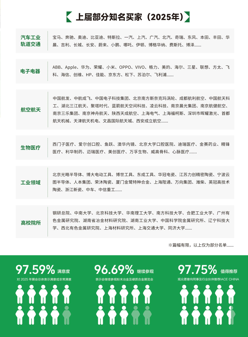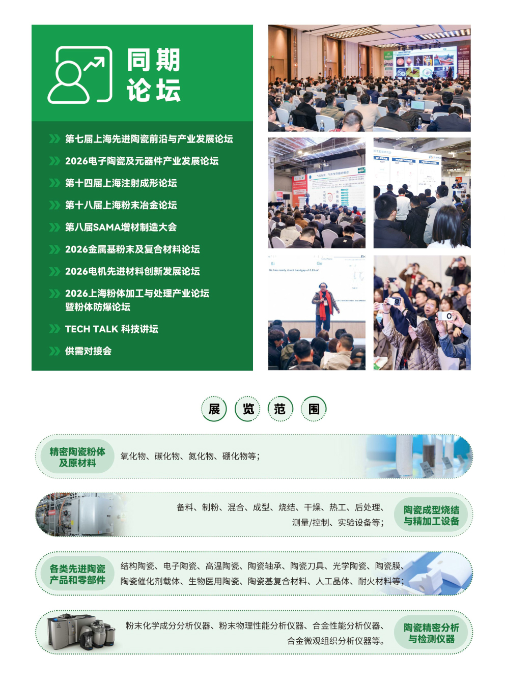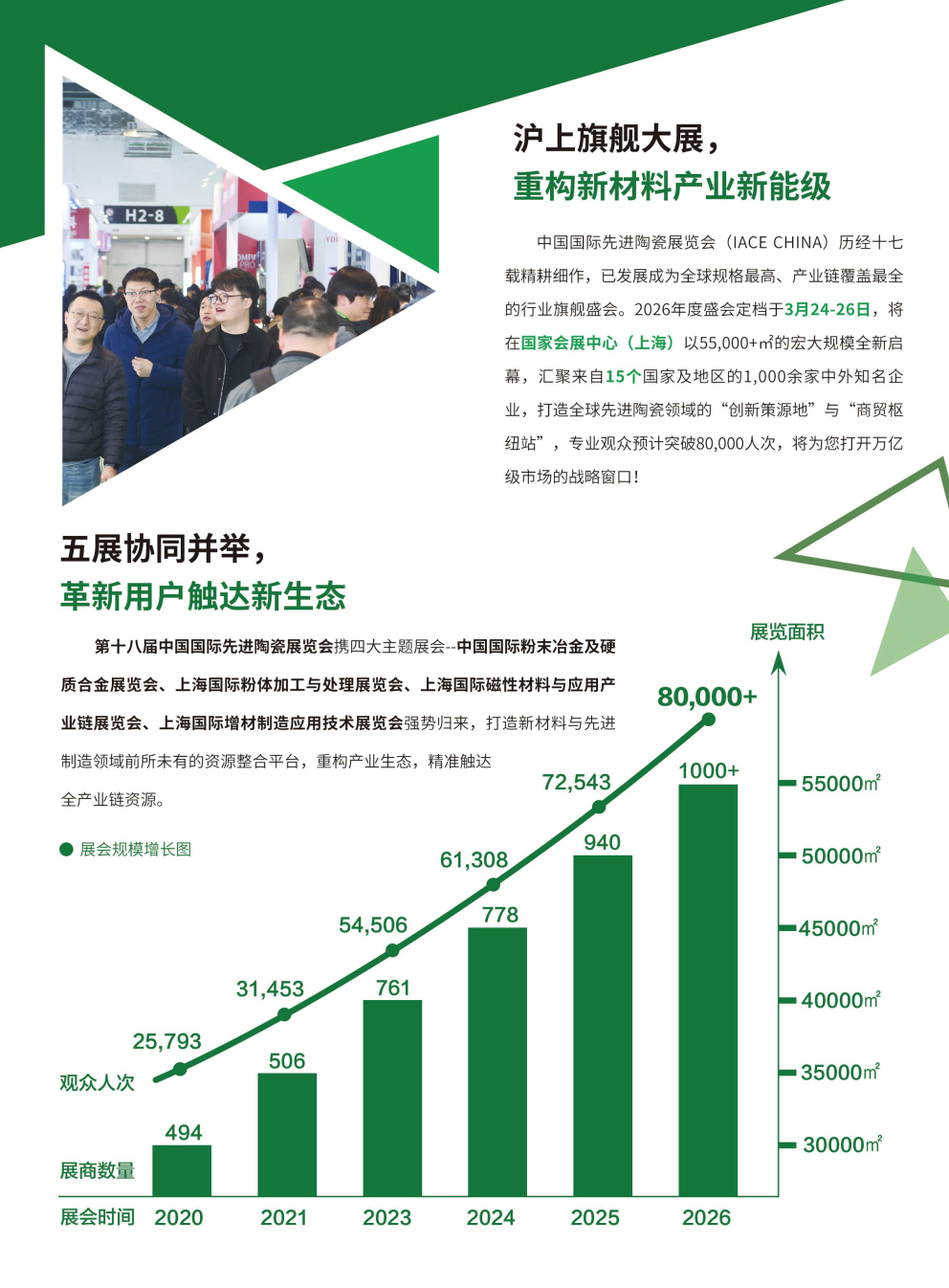 同期同地举办第十八届中国国际粉末冶金及硬质合金展览会(PM CHINA 2026)、2026上海国际磁性材料与应用产业链展览会(MMIC CHINA 2026)、2026上海国际增材制造应用技术展览会(AM CHINA 2026)、2026上海国际粉体加工与处理展览会(POWDEX CHINA 2026)五展协同,总规模可覆盖55,000㎡超大展区,达到80,000+人次专业观众。展会将携手1,000+家 中外名企,共同助力先进陶瓷产业升级!