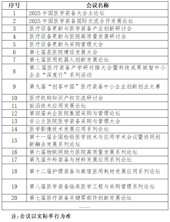 与展会同期举办的2025中国医学装备大会主要活动包括论坛会议、创新成果发布、创新大赛、技术推介、科普活动和其它相关配套活动,活动总体规模180场次左右,预计参加人数4万人。部分论坛会议安排如下: