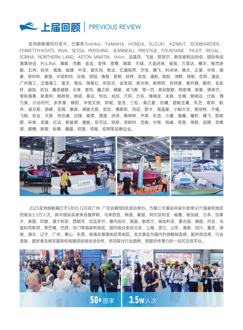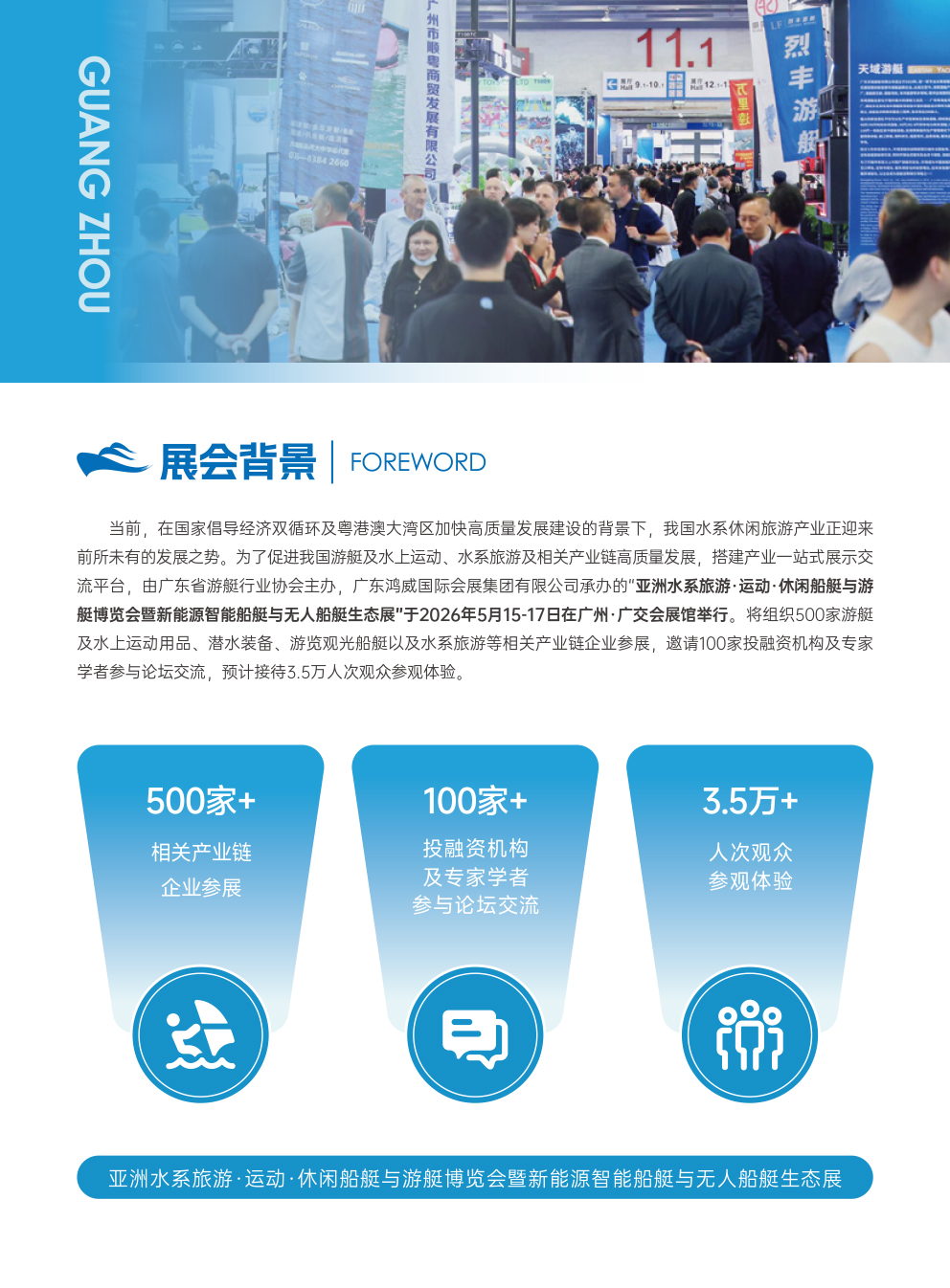 当前,在国家倡导经济双循环及粤港澳大湾区加快高质量发展建设的背景下,我国水系休闲旅游产业正迎来前所未有的发展之势。为了促进我国游艇及水上运动、水系旅游及相关产业链高质量发展,搭建产业一站式展示交流平台,由广东省游艇行业协会主办,广东鸿威国际会展集团有限公司承办的“2026亚洲水系旅游·运动·休闲船艇与游艇博览会”于2026年5月15-17日在广州˙广交会展馆举行。将组织500家游艇及水上运动用品、潜水装备、游览观光船艇以及水系旅游等相关产业链企业参展,邀请100家投融资机构及专家学者参与论坛交流,预计接待3.5万人次观众参观体验。