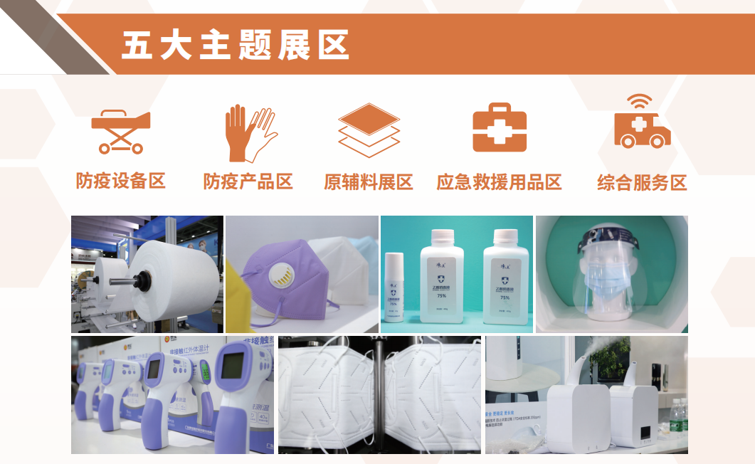 五大展区覆盖防疫设备、防疫产品、原辅料、应急救援物品、综合服务,让你一站式配齐心仪的“抗疫神器”