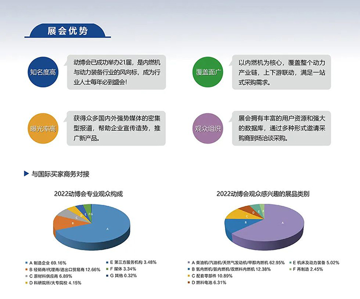 由中国内燃机工业协会主办、中国机床专用技术设备有限公司、汽车工艺装备成套开发集团协办的2023中国国际内燃机及动力装备博览会(简称“动博会”)将于2023年11月15日-17日在南京国际博览中心隆重举办。本届博览会以"动力改变世界"为主题,全面展示国内外内燃机及动力装备制造产业的新产品、新技术,新趋势,展品覆盖发动机、数控机床、工业机器人、检测设备、3D打印、发电机组、应急动力装备、户外动力设备等多个领域。20多年来,动博会凭借扎实的行业基础,全面细致的专业服务积累了数万海内外专业观众,是企业推广新产品,交流新技术,提升品牌影响力、促进经贸洽谈与合作的优选行业盛会。