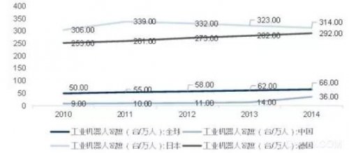 OFweek机器人网讯:我国制造业自动化程度尚处于较低水平,提升空间巨大。工业机器人密 度作为工业自动化率的重要指标,2014年我国的机器人密度仅为36台/万人,远低于日本的314台/万人、德国的292台/万人,仅为国际平均水平66 台/万人的55%,距制造业强国尚有约9倍的增长空间。到2020年机器人密度要达到100台/万人以上,提升空间巨大。