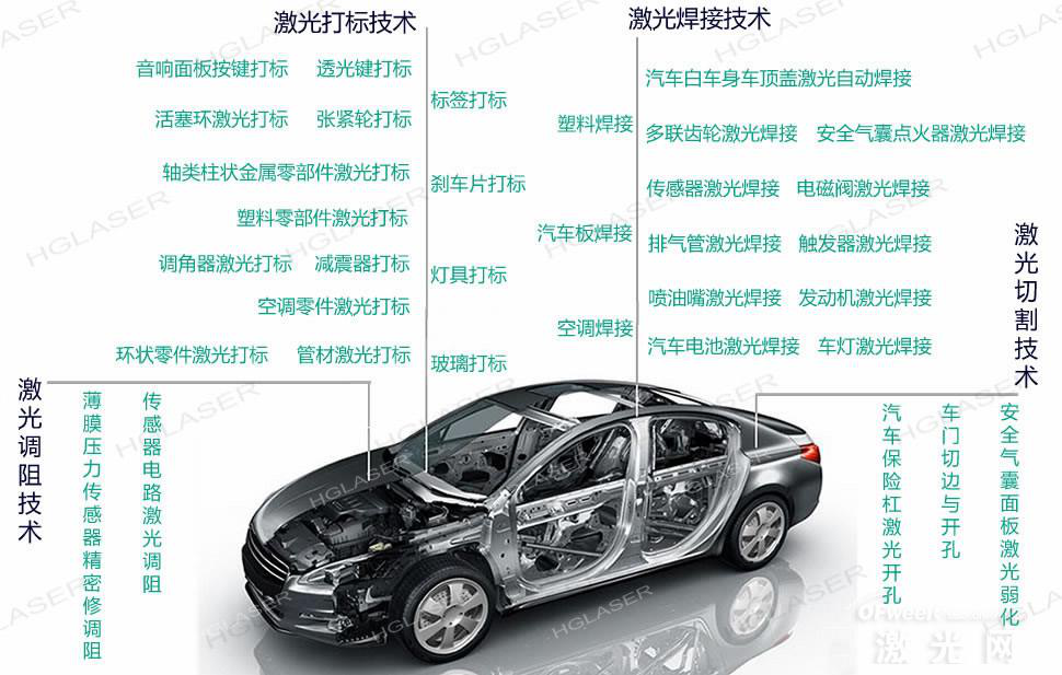 激光技术已经渗透到汽车制造的方方面面,涵盖从焊接、切割、打孔、打标、热处理以及成形,甚至到电子系统的微加工等领域。在发达国家的汽车工业中,有50%-70%的零部件是采用激光加工完成的。