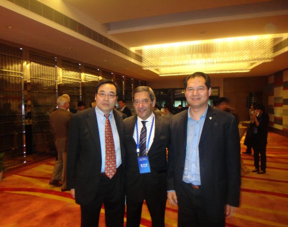 左起.上海临港发展集团监事会主席、上海后世博研究中心副理事长杨德林、中美清洁能源论坛联名主席、创始人贝尔、张财根总裁在论坛上合影
