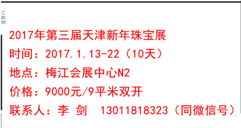 展会概况; 天津国际珠宝首饰展经过多年的发展,已成长为中国重要的珠宝展,历届总展出面积超过8万平方米,吸引了来自浙江、上海、广东、云南、新疆、江苏、广西、东北、山东……阅读全文>>展会日期:2017-01-13至2017-01-22  举办展馆:天津梅江会展中心